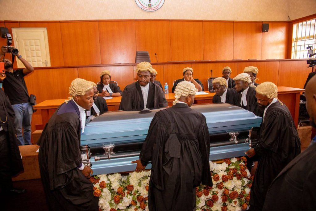 High point of the Valedictory session was moving of motion on notice by the applicant, the Nigeria Bar Association, Yenagoa Branch led by its Chairman, Mr. Clement Kekemeke and reply by the Respondent, the Attorney General and Commissioner for Justice, Mr. Biriyai Dambo, service of court order on the parties and the family, ruling by the Chief Judge and a file past the casket of Senator Ewhrudjakpo by the Chief Judge and visiting Chief Judges, Magistrates and Chairmen of Customary Courts, Chairmen and members of the NBA Yenagoa and Sagbama branches, the bereaved family and the public.
