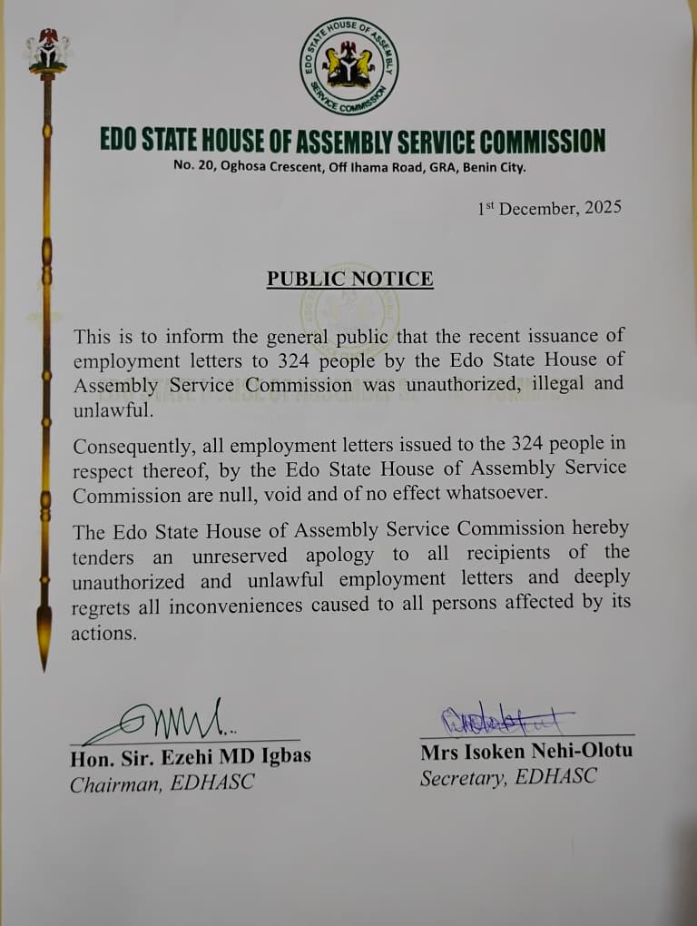 Edo State Edo State house of Assembly service commission says the recent issuance of employment letters to three hundred and twenty four persons by the commission was unauthorised, illegal and unlawful.