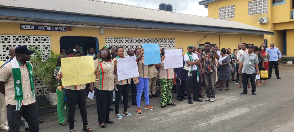 The protesters who carried various placards within the hospital premises with different messages accused Dr. Osim of flouting the ministry’s directive on the appointment of a substantive CMD, including victimisation, high-handedness, and harassment of staff.